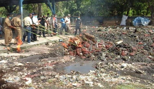 BENGKALIS - Bea dan Cukai Kabupaten Bengkalis memusnahkan 1500 kampit Bawang Merah ilegal di TPA Bantan, Senin (09/01/2017).