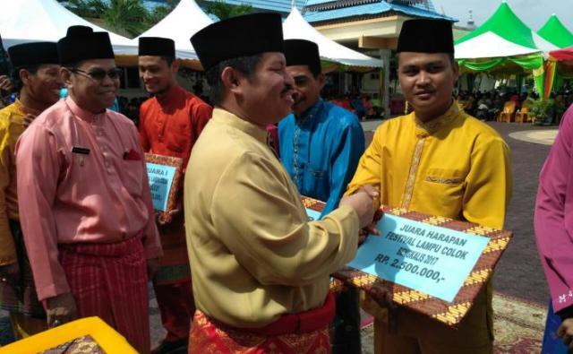 Sebelum tausiah, dimulai Bupati Amril didampingi Wabup Muhammad menyerahkan hadiah kepada pemenang festival lampu colok dan pawai takbir.
