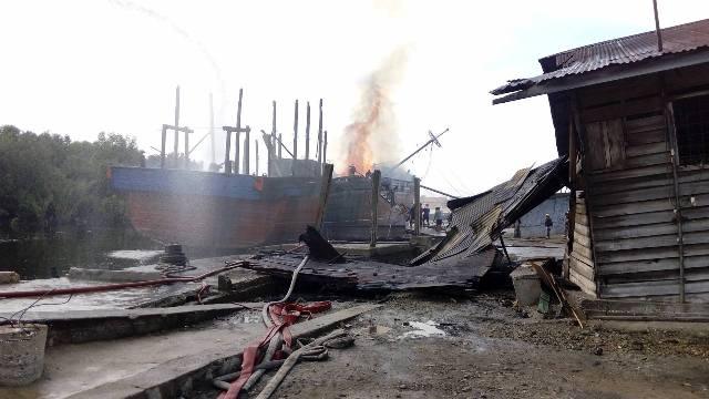 DUMAI - Sebuah kapal Sembako dengan nama KLM Agung Perkasa terbakar hebat. Api dengan cepat melahap hingga merembet ke gudang, pada Minggu (19/2/2017) pagi di pelabuhan nelayan Jalan Teduh, Kelurahan Pangkalan Sesuai, Kecamatan Dumai Barat.