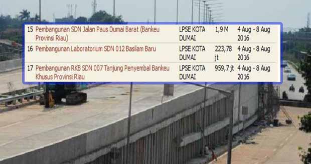 Meski demikian, dalam website resmi LPSE Dumai telah diumumkan pertama kali lelang proyek sebanyak tiga paket pada Kamis (04/08/2016) kemarin, diantaranya, Pembangunan SDN Jalan Paus Dumai Barat (Bankeu Provinsi Riau) sebesar Rp1.9 miliar, Pembangunan Laboratorium SDN 012 Basilam Baru Rp223,78 juta, dan Pembangunan RKB SDN 007 Tanjung Penyembal Bankeu Khusus Provinsi Riau Rp959,7 juta.