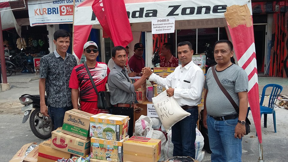 DUMAI- Ketua Pimpinan Anak Cabang (PAC) Pemuda Pancasila Kecamatan Dumai Timur Kota Dumai menyerahkan bantuan korban kebakaran Jalan Bintan Gg Kuini, melalui POSKO Bantuan MPC Pemuda Pancasila Kota Dumai Senin (04/04/2016).