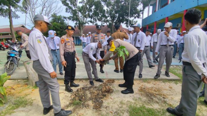 DUMAI — Dalam rangka mendukung program Green Policing dan menumbuhkan kepedulian generasi muda terhadap lingkungan hidup, Polsek Dumai Timur melaksanakan kegiatan edukasi lingkungan dan penanaman pohon bersama para siswa SMK Perminyakan PGRI Kota Dumai, Senin (27/10/2025) pagi.