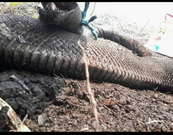 Dalam foto itu tampak seekor ular piton berukuran besar mati mengenaskan. Sekujur kulitnya menghitam, hangus karena terbakar.