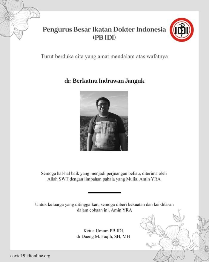 globalriau.com - Dokter Berkatnu Indrawan Jangkuk meninggal di usianya yang ke 28 di RSUD Soewandhie Surabaya. Kondisi kesehatannya yang menurun derastis setelah tertular Virus Corona dari pasien asal Pemalang yang ia tangani.