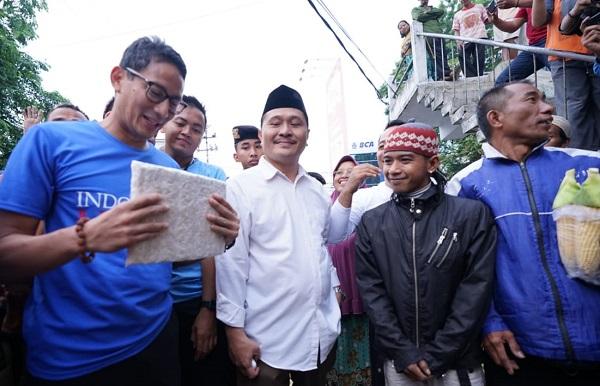 Pedagang tempe senang bukan kepalang kerika cawapres dukungan PKS, PAN, Gerindra, Demokrat dan berkarya ini membeli tempe yang dijajakannya. “Harganya 10 ribu, tapi di kasih Pak Sandi 100 ribu. Rejeki ini, rejeki ya Allah,” kata si ibu penjual tempe ini sambil menempelkan uang 100 ribu ke keningnya.