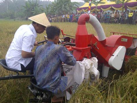 ROHIL- Bupati Rohil Suyatno panen raya padi di Kepenghuluan Teluk Pulau Hulu Kecamatan Rimba Melintang menggunakan Combine Harvester. Kawasan ini dijadikan pelopor pertanian modern.
