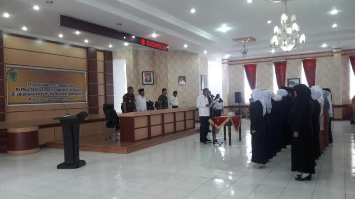 BAGANSIAPIAPI- Bupati Rokan Hilir H.Suyatno lantik 19 Kepala Sekolah dan 2 Pengawas Sekolah.Mereka dilantik untuk mengisi kekosongan jabatan yang sudah lama terjadi.Selain itu,Pelantikan itu berdasarkan Peraturan Menteri Pendidikan Nasional (Permendiknas) Nomor 28 Tahun 2010 Tentang Penugasan Guru sebagai Kepala Sekolah.