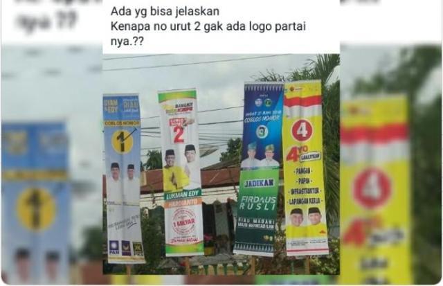 Dan untuk tiga baliho paslon lainnya tampak semua mengenakan logo partai pengusungnya. " Ada yang bisa jelaskan kenapa nomor urut 2 tidak ada logo partainya.??," tulis akun facebook Natsir Rittongga di gruf Bagan Batu Facebooker, Jumat 23/3 siang.