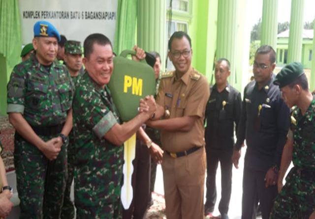BAGANSIAPIAPI- Panglima Daerah Militer ( Pangdam) I Bukit Barisan Mayjend.TNI Lodewyk Pusung resmikan keberadaan Markas Komando Distrik Militer ( Makodim) 0321 di Rokan Hilir,Senin,(22/02/16).Pangdam salut dengan Pemkab Rohil yang telah membangun gedung Makodim yang begitu megah.Ia berharap keberadaan Kodim 0321 bermanfaat bagi masyarakat Rohil.