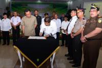 Bupati Bengkalis Amril Mukminin dan Ketua DPRD Bengkalis, Heru Wahyudi beserta bupati/waliko dan ketua DPRD kabupaten/kota se-Provinsi Riau, menandatangani komitmen untuk mewujudkan tata kelola pemerintahan yang bersih dan bebas dari Kolusi Korupsi dan N