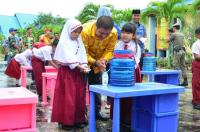 Di tengah rintik gerimis pagi, Bupati Bengkalis Amril Mukminin dan Ketua PKK Bengkalis Kasmarni serta anggota Forkopimda bersama anak-anak sekolah dasar (SD) di Kecamatan Bantan, Sabtu pagi (5/11/2016) secara serentak memperagakan cuci tangan pakai sabun.